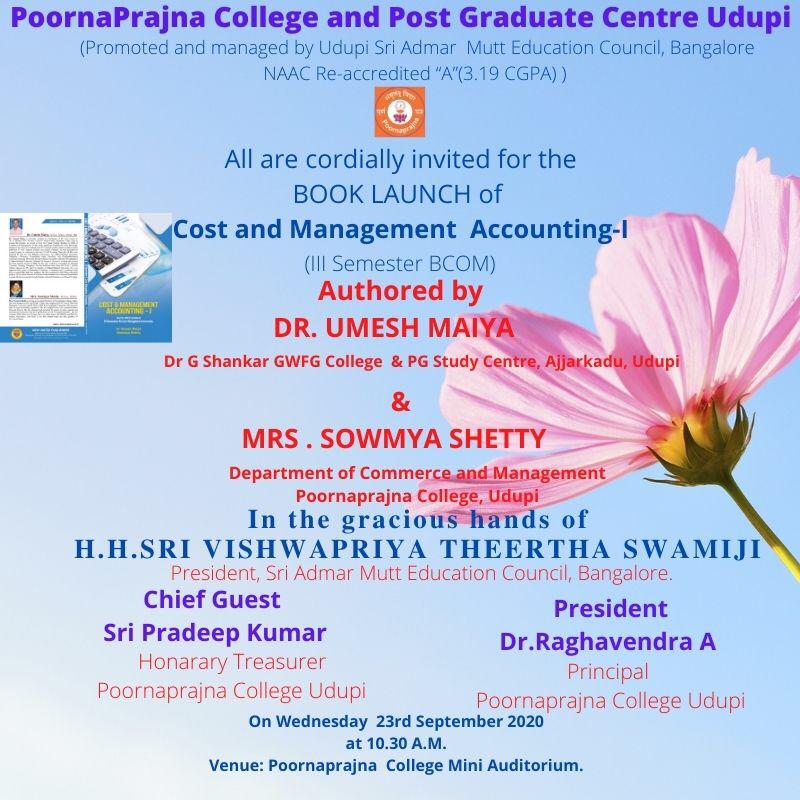 ಉಡುಪಿ: ಪೂರ್ಣ ಪ್ರಜ್ಞಾ ಪದವಿ ಕಾಲೇಜಿನ ವಾಣಿಜ್ಯ ವಿಭಾಗದ ಪ್ರಾಧ್ಯಾಪಕಿ ಸೌಮ್ಯ.ಲೋಕೆಶ್. ಶೆಟ್ಟಿ ಹಾಗೂ ಡಾ. ಜಿ.ಶಂಕರ್ ಮಹಿಳಾ ಕಾಲೇಜಿನ ಪ್ರಾಧ್ಯಾಪಕರಾದ ಡಾ. ಉಮೇಶ್ ಮಯ್ಯ ಅವರು ಜೊತೆಗೂಡಿ ಬರೆದ ತೃತೀಯ ಸೆಮಿಸ್ಟರ್ ತರಗತಿಯ ಕಾಸ್ಟ್ ಅ್ಯಂಡ್ ಮ್ಯಾನೇಜ್ಮೆಂಟ್ ಅಕೌಂಟಿಕ್ ಪುಸ್ತಕವನ್ನು ಅದಮಾರು ಮಠದ ಹಿರಿಯ ಯತಿ ಶ್ರೀ ವಿಶ್ವಪ್ರಿಯ ತೀರ್ಥರು